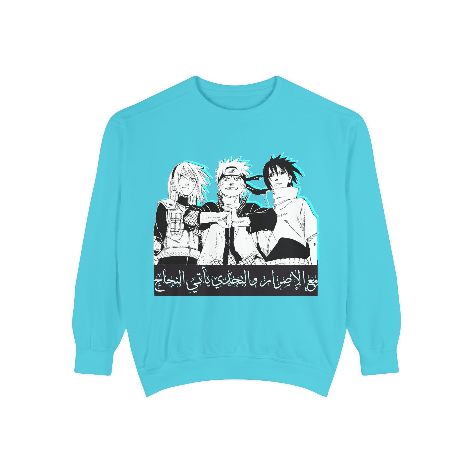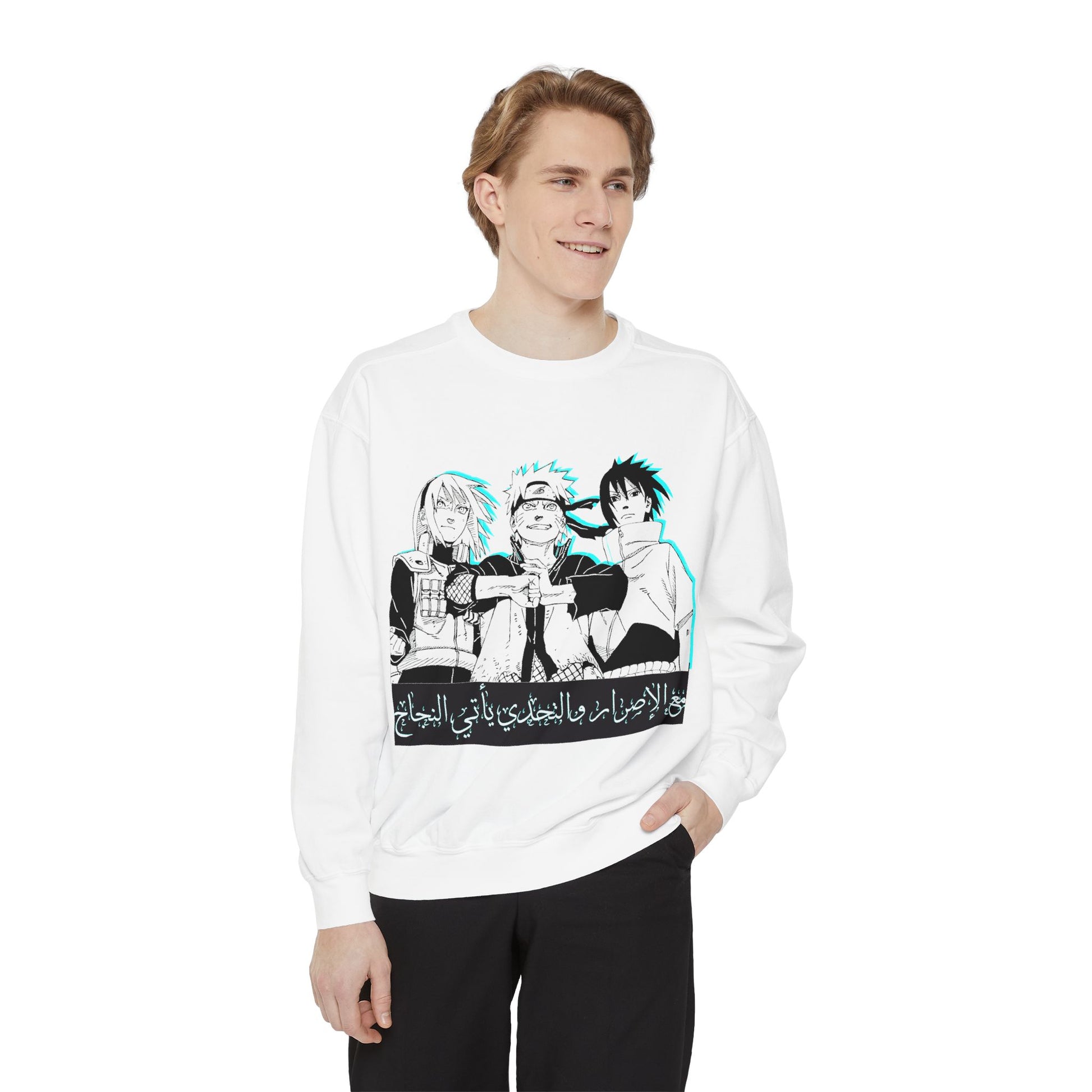 Anime Crewneck Sweatshirt — Trio Graphic with Arabic Text, Retro Glitch Aesthetic